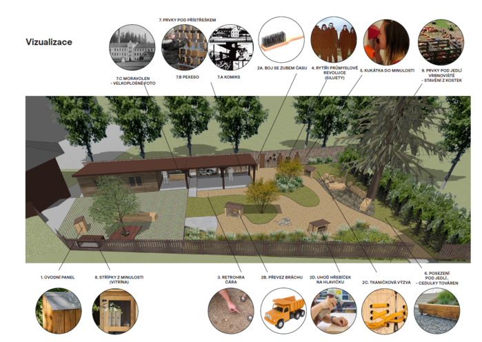 Vrbno pod Pradědem bývalo jedním z průmyslových center Rakouského Slezska. Díky vynalézavosti a podnikavosti místních továrníků, ale i řemeslné dovednosti dělníků, se zde vyráběly produkty, které nacházely své místo po celém světě – od tkaniček do bot přes skleněné výrobky až po ikonické plastové hračky. Interpretační zahrada tyto příběhy oživuje prostřednictvím kukátek do minulosti, siluet významných průmyslníků nebo interaktivních prvků inspirovaných ikonickými produkty vrbenských továren.